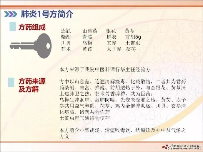 据悉,肺炎1号方在广州市第八人民医院的新型冠状病毒感染肺炎治疗中显示:治疗新型冠状病毒感染轻症肺炎确诊病人50例,经1周临床观察,全部患者体温恢复正常,50%患者咳嗽症状消失,52.4%咽痛症状消失,69.6%乏力症状消失,总体症状明显好转,无一例患者转重症。