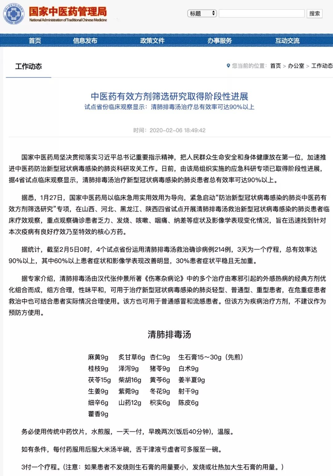 2月6日,国家中医药管理局发布了《中医药有效方剂筛选研究取得阶段性进展》。
