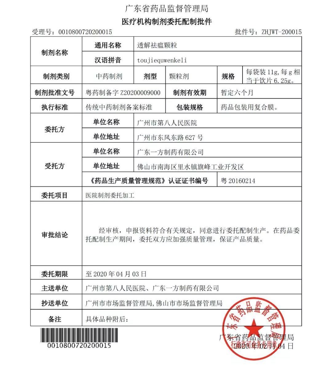 1月31日,广东省药监局拟将广州市第八人民医院拟申报的医疗机构制剂肺炎一号方纳入应急审批,待申请人整理提交申报材料后,将即时审批。