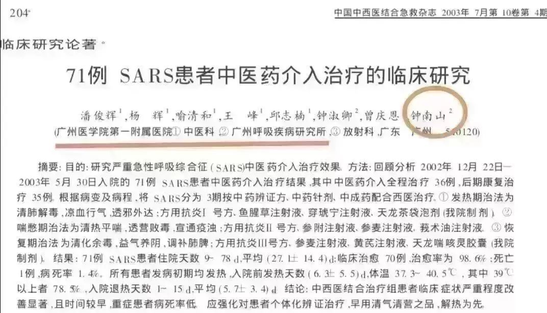 当时邓铁涛的广州中医药大学一附院治了36个病人,全部吃中药治疗,而让西医确认痊愈,病人0死亡,医护0感染,平均退热时间2.97天,炎症阴影吸收平均6.2天,平均住院时间8.86天。