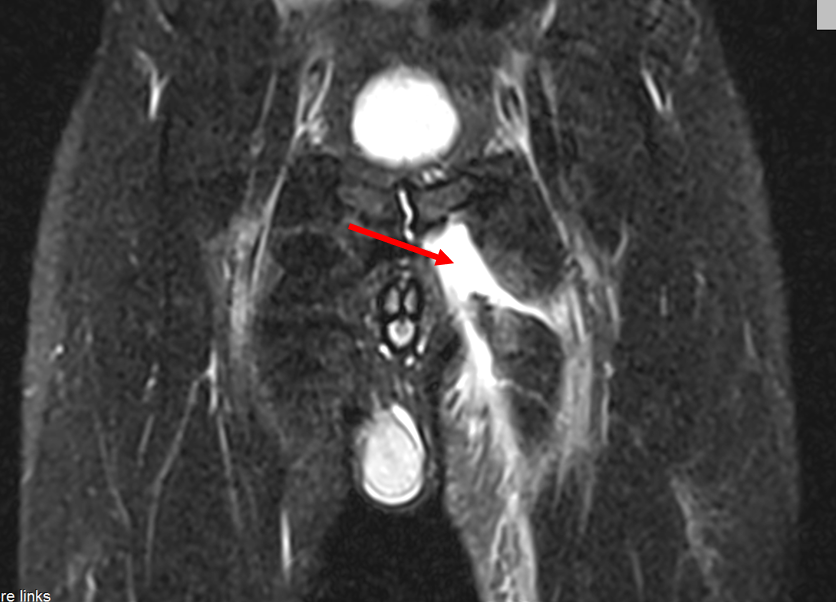 图1 骨盆MRT显示出明显的长收肌血肿-红色箭头