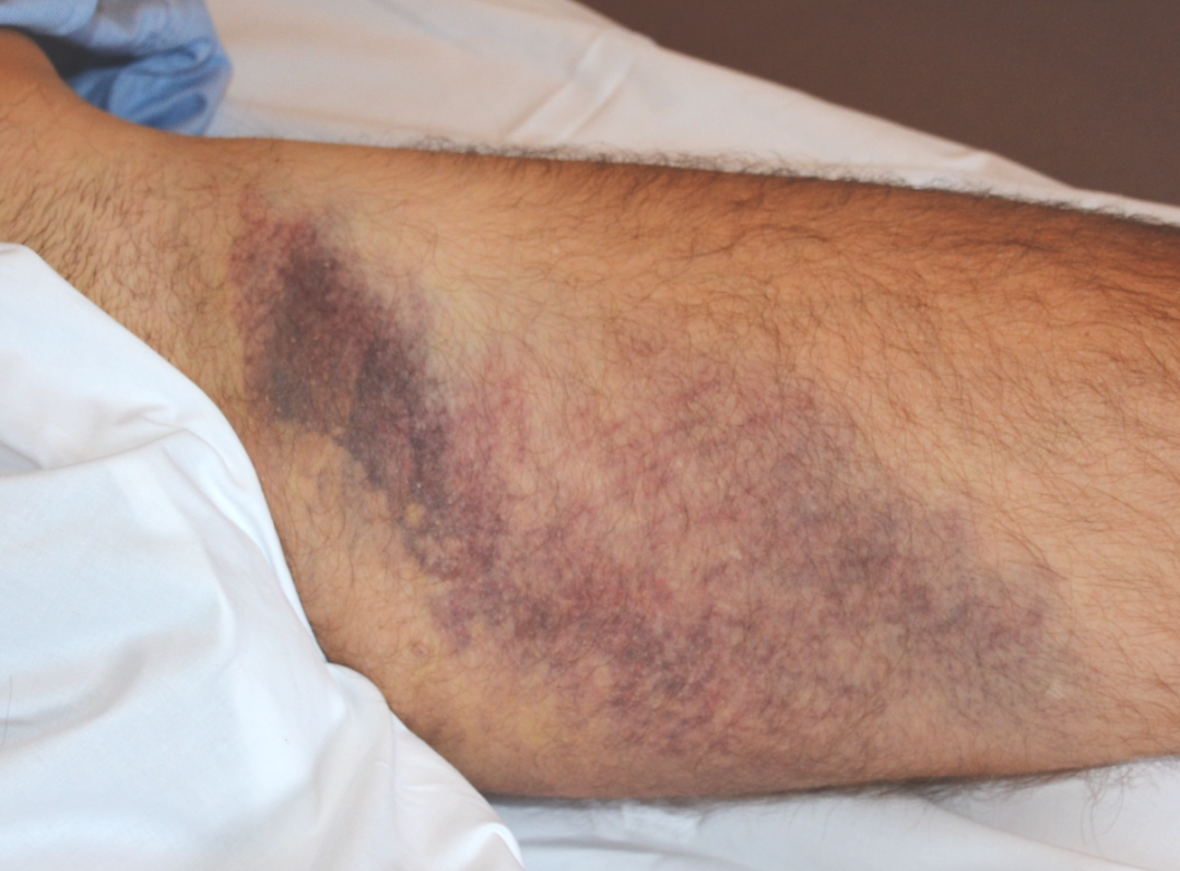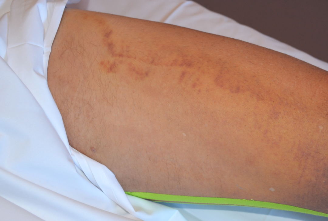 54岁男性患者,网球比赛中,为了打削球,向前跨了一大步。动作初期,他感到左腹股沟刺痛,同时听到类似于“撕纸”的声音,这导致其腿部功能完全丧失,以至于不得不在对手的帮助下离开球场。核磁共振成像(MRI)显示病人内收肌长肌不完全撕裂,如果其功能持续丧失,创伤外科医生会考虑手术治疗。患者每天接受1次淋巴引流治疗,每次1小时并持续8天后,血肿几乎消失。创伤后6周,患者重返网球运动。在此期间,他只是在跨步较大的情况下,才会感觉到“轻微的牵拉”,而两周后这种牵拉感也完全消失了。